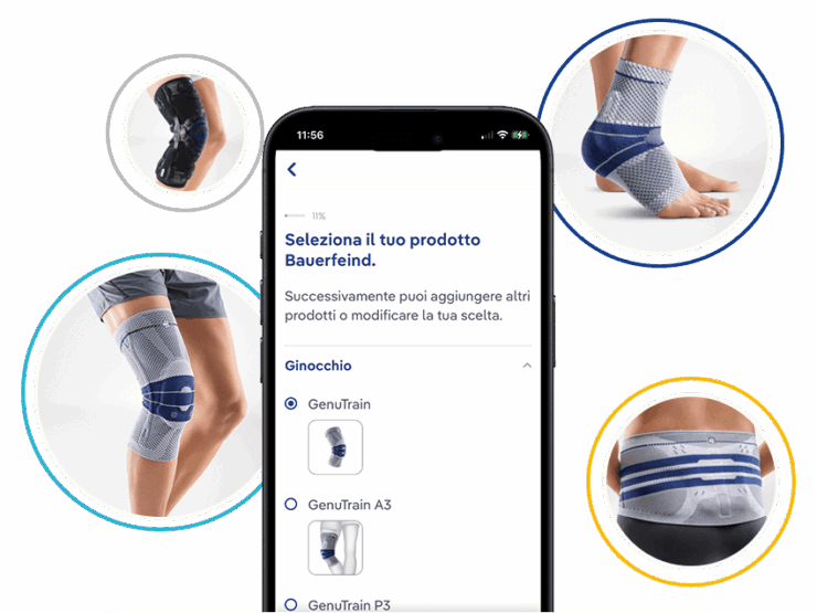 Per supportarti in tal senso, i nostri esperti hanno sviluppato Bauerfeind Therapy App. Riceverai un programma di allenamento personalizzato per il tuo prodotto, corredato da tante informazioni utili. Così potrai trarre il massimo beneficio dal tuo tutore o dalla tua ortesi!